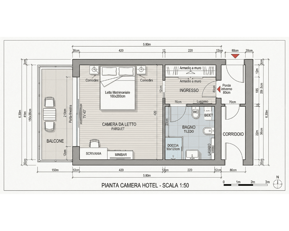 Una pianta tecnica in scala 1:50 che definisca il layout della camera e del bagno nell’ingombro di 36 m².