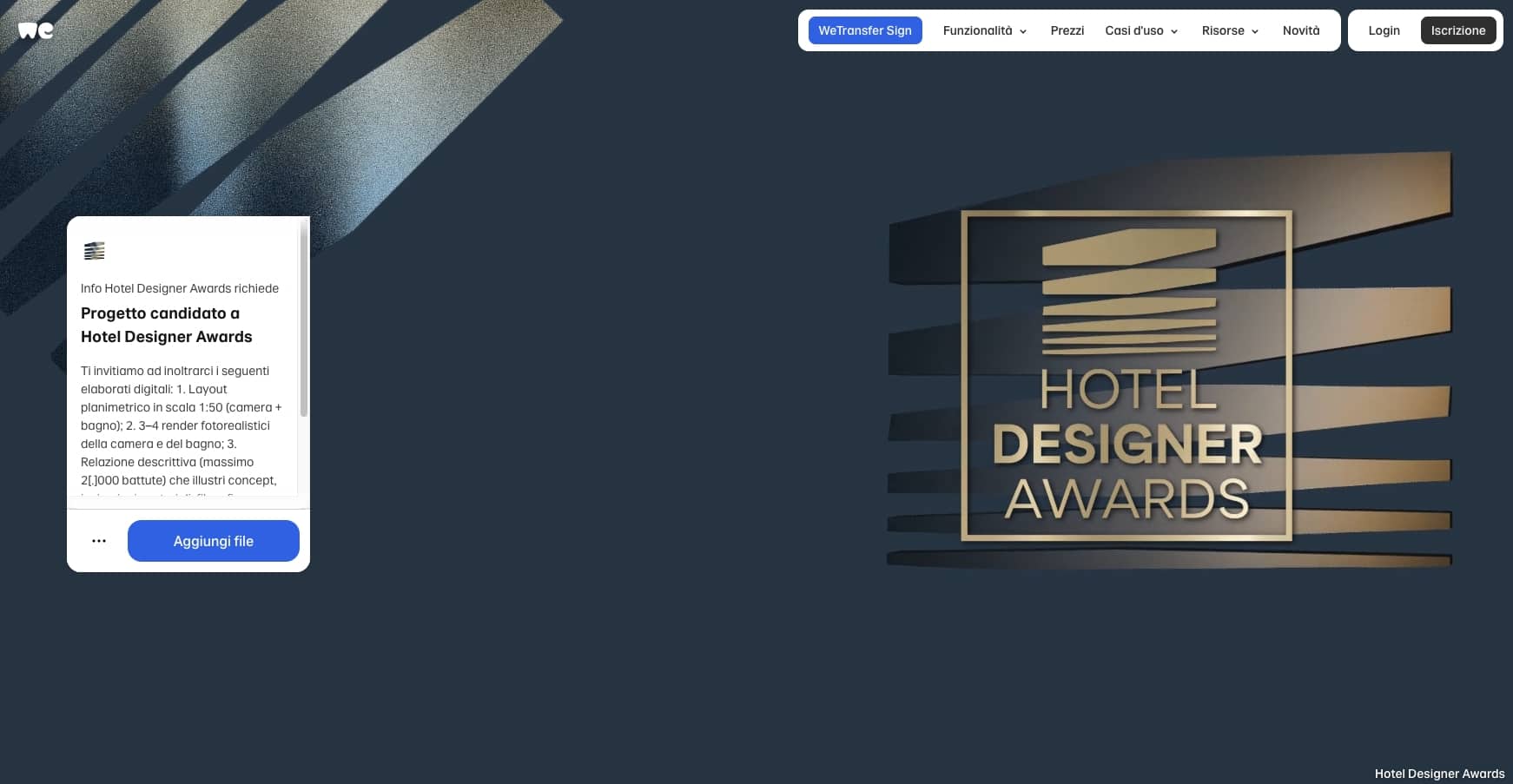 Una volta completata la candidatura online, riceverai via email un link WeTransfer personalizzato. Sarà il tuo spazio riservato per caricare gli elaborati e presentare la tua visione alla giuria.